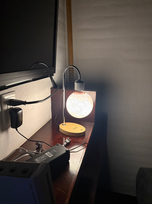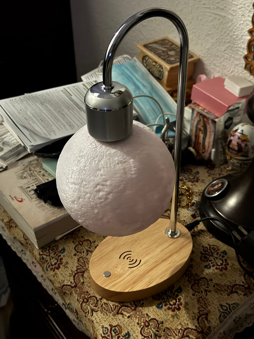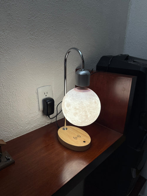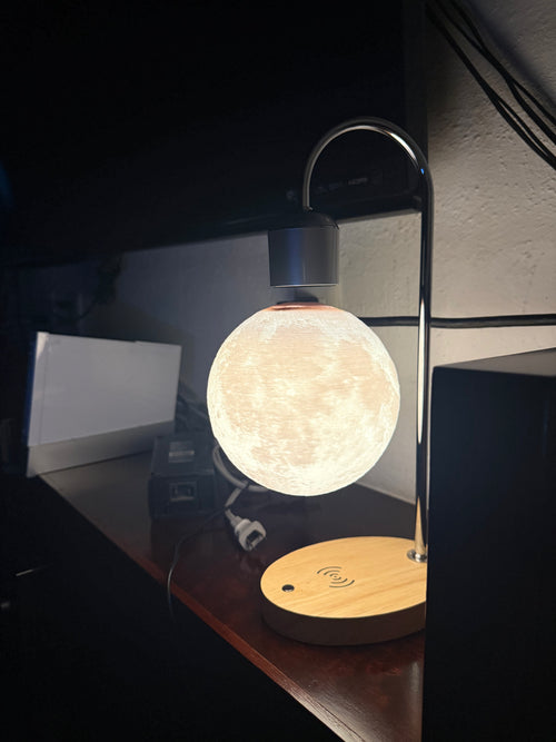 It transfers electricity through the air to light up the internal LEDs of the moon without physical connections.
